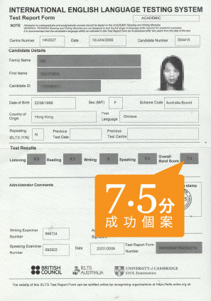 香港城市大學商學院二年級學生 (2009) 「剛考入大學後由於準備要到澳洲學術交流,為爭取學術交流的取錄機會,我決定報考IELTS課程。其間一直去了解不同院校提供的IELTS課程,雖然某些有名氣的院校亦有提供IELTS課程,但考慮到現在太多同學有6.5分,這個分數未必能為我帶來太大優勢。 後來經朋友介紹下得知SINO EDUCATION提供的IELTS課程幫助學員一take取得7分,故此我選擇了報讀這裡的IELTS課程。 這裡的課程很專業,導師亦都很耐心去教,提供很多paper給我操練,並逐一糾正我的錯處。此外,透過職業英語課程大大改善我的Oral English,最後我取得7.5分,十分感激SINO EDUCATION為我提供這個課程。」